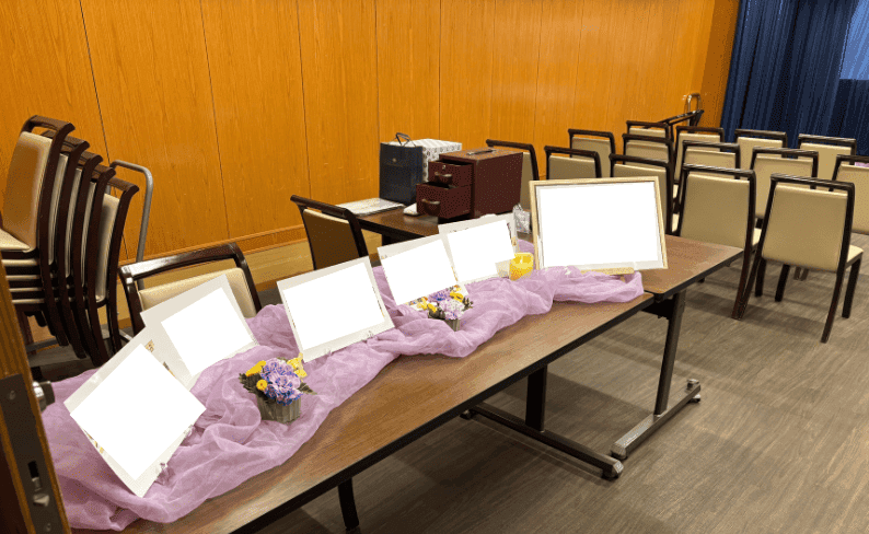 職場の方々が届けてくださった現役時代の生き生きとしたお写真を飾らせていただきました。 心幸では、形式的な葬儀だけでなく、故人様が歩んでこられた人生や、ご家族との絆を形にする「世界に一つだけのコーナー作り」を大切にしております。