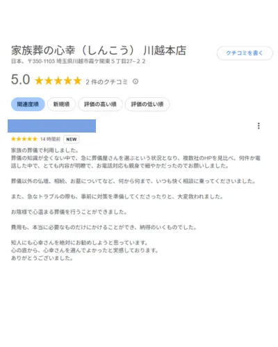 今回は、川越市民聖苑葬儀(やすらぎのさと)にて一日葬を執り行われたご遺族様より、Googleマップへお寄せいただいた温かいお言葉をご紹介させていただきます。 「初めての葬儀で何から始めたらいいか分からない」という不安を抱えていらっしゃったお客様の事例です。同じようなお悩みをお持ちの方の参考になれば幸いです。だいた温かいお言葉や、身の引き締まるご指摘の一部をご紹介させていただきます。